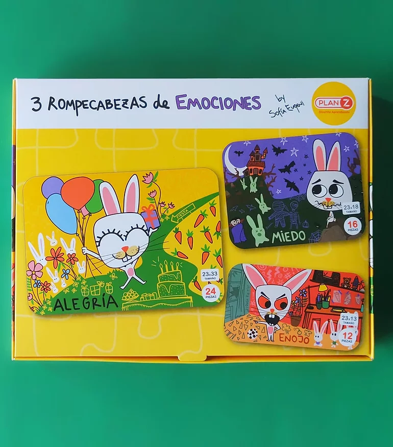 Incluye: rompecabezas alegría ( 24 piezas ) + rompecabezas miedo ( 16 piezas) + rompecabezas enojo ( 12 piezas)