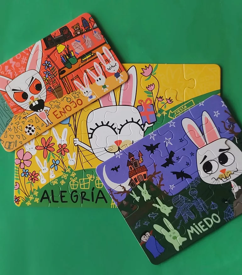 ¡Ahora en cartón! Algunos días conejín siente miedo, otros está contento y otros está enojado ¡Armá los rompecabezas y descubrí todas las emociones de nuestro amigo conejín! Los rompecabezas ayudan a ejercitar ambos lados del cerebro, incrementan la concentración, desarrollan la creatividad y la paciencia y mejoran las habilidades motoras.