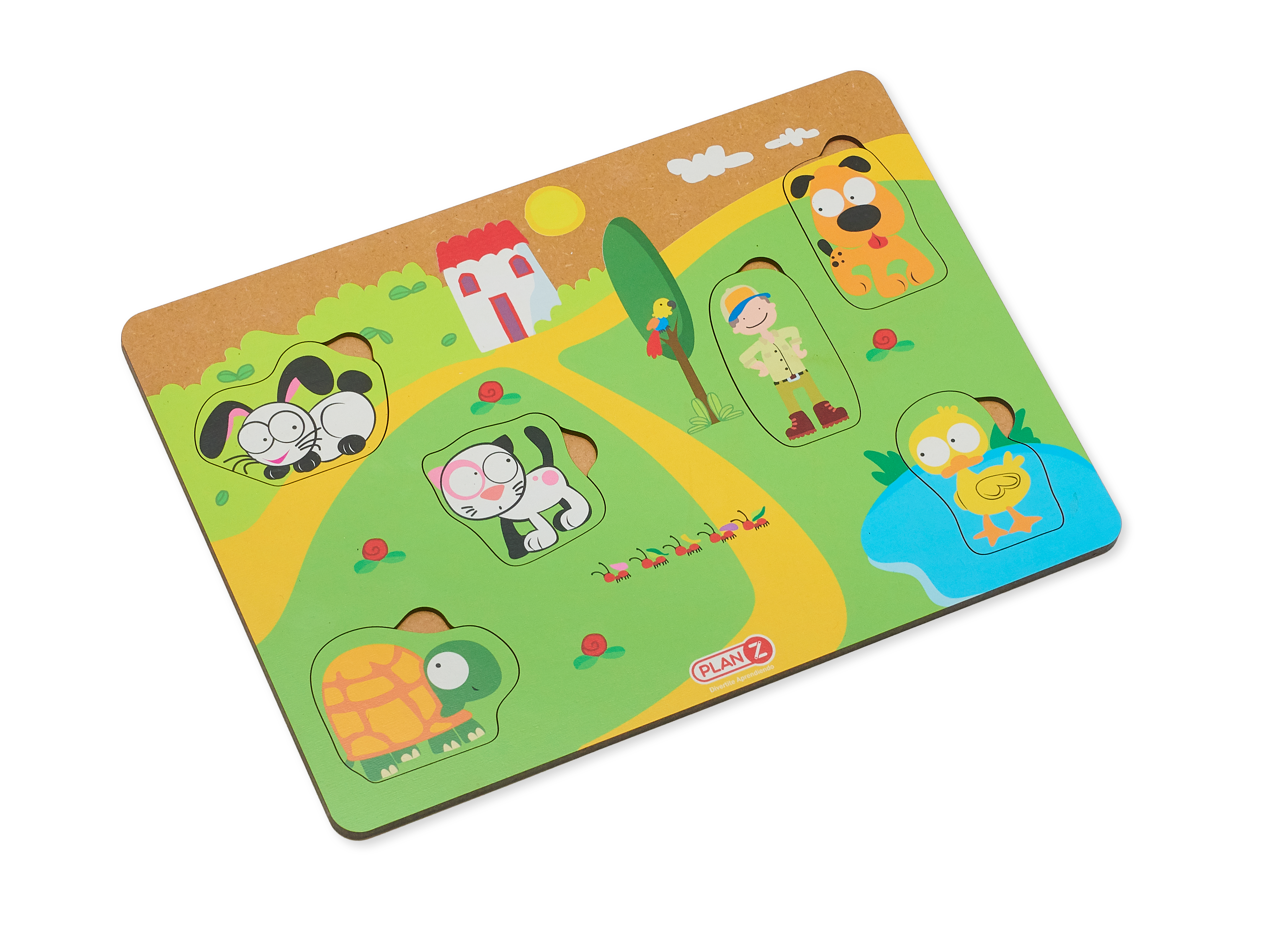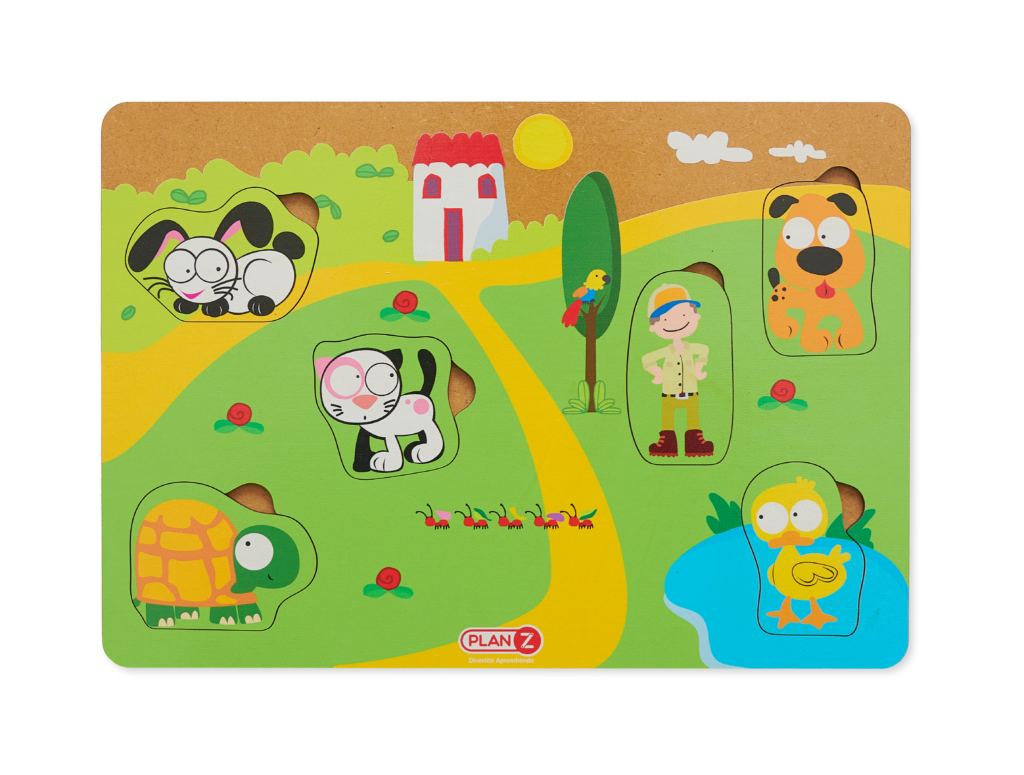 En este juego cada uno de nuestros amigos ocupa un lugar, ¿te animas a descubrirlos? Los juguetes de madera no tienen la ligereza de los juguetes de plástico. Son juguetes con mayor presencia. Los niños tienen que sujetarlos con conciencia y firmeza, estimulando, a su vez, la motricidad de las manos. Incluye 6 piezas diferentes de encastre: conejo, gato, perro, tortuga, pato y cuidador. El encastre es SIMPLE. Tamaño de la base: 28x20x1cmPeso: 292g Habilidades que desarrolla: espacio, motricidad y creatividad.