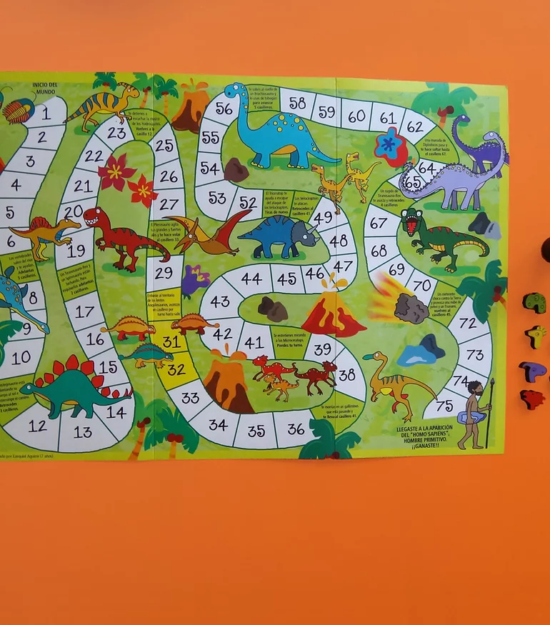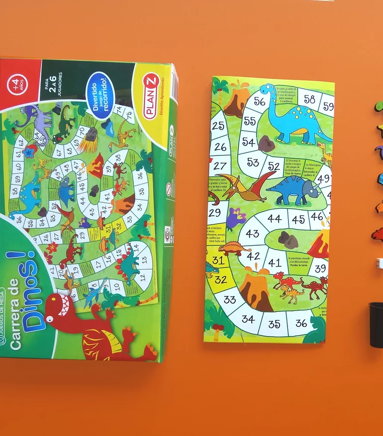 ¡Divertido y colorido recorrido para conocer a estos enormes amigos! En cada casillero aprenderás algo nuevo sobre ellos ¡¡A tirar los dados y a jugar!! Los juegos de recorrido enseñan a respetar las normas, mejoran la capacidad de analisis, mejoran e impulsan la cooperación y desarrollan la memoria. Incluye Caja y tablero de cartón super resistente. Vasito, dado y 6 dinos de madera para avanzar en los casilleros. Tamaño de caja: 31x18x4cmPeso: 158g Habilidades que desarolla: atención visual, memoria y espacio.